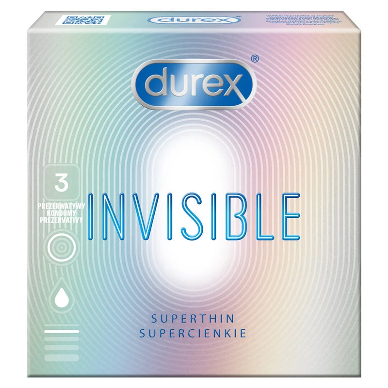 Durex Invisible Extra Lubricated is a transparent, teat-ended, straight sided, natural rubber latex condom with a non-spermicidal lubricant.