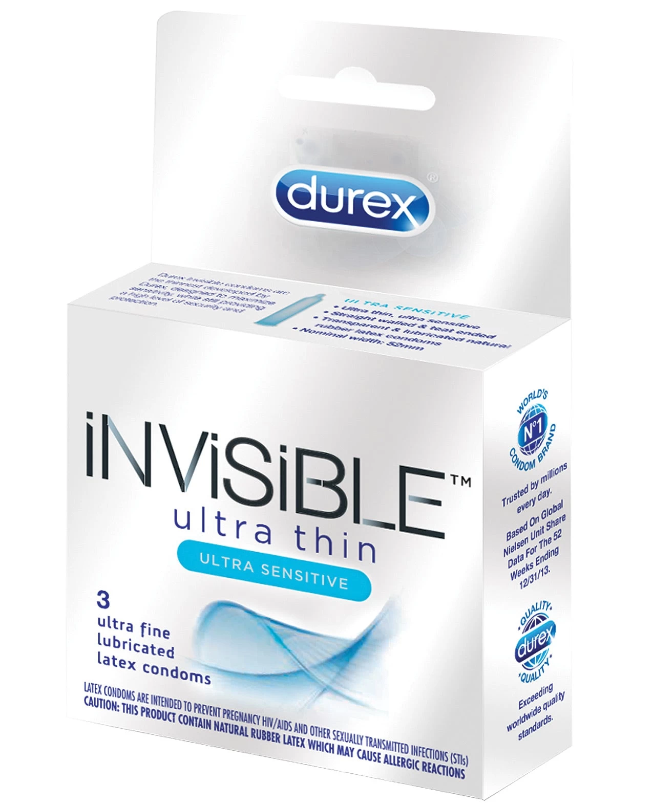 Durex Invisible Extra Sensitive is a transparent, teat-ended, straight sided, natural rubber latex condom with a non-spermicidal lubricant.