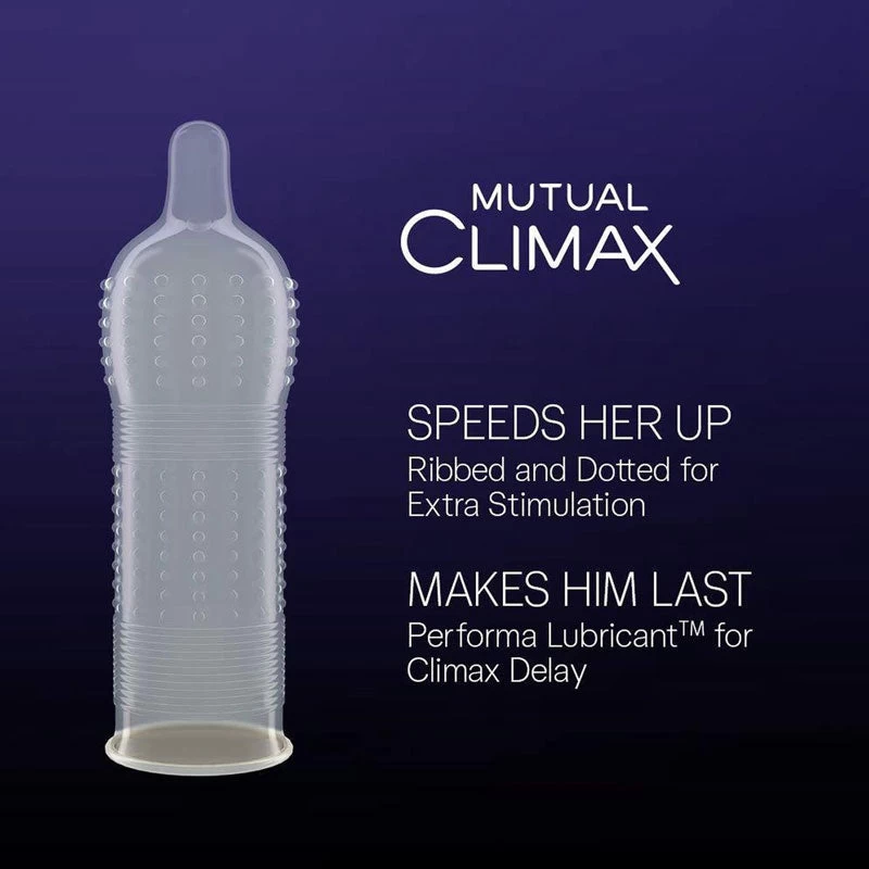 Durex Mutual Climax is designed to reach a mutual climax for both partners. These condoms are perfect for those who experience premature ejaculation and want to avoid early climaxes. A slight amount of benzocaine (only 5%) inside the condom reduces sensitivity and delays his ejaculation.
