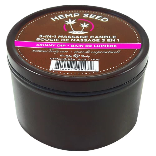 Earthly Body 3-in-1 Massage Candle is enriched with Vitamin E and all natural oils (including Hemp, Apricot, Avocado, Coconut, Jojoba). Formulated without preservatives, the product is 100 % vegan.