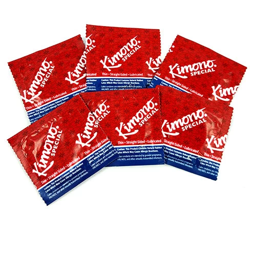 Kimono Special are lubricated, teat-ended, straight-sided shape, natural rubber latex condoms.