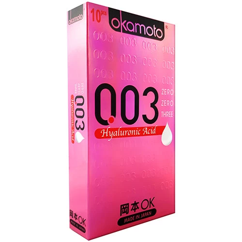 Okamoto 003 Hyaluronic Acid is a natural color, straight-sided, reservoir-ended, easy unrolling, natural rubber latex condom with a non-spermicidal lubricant.