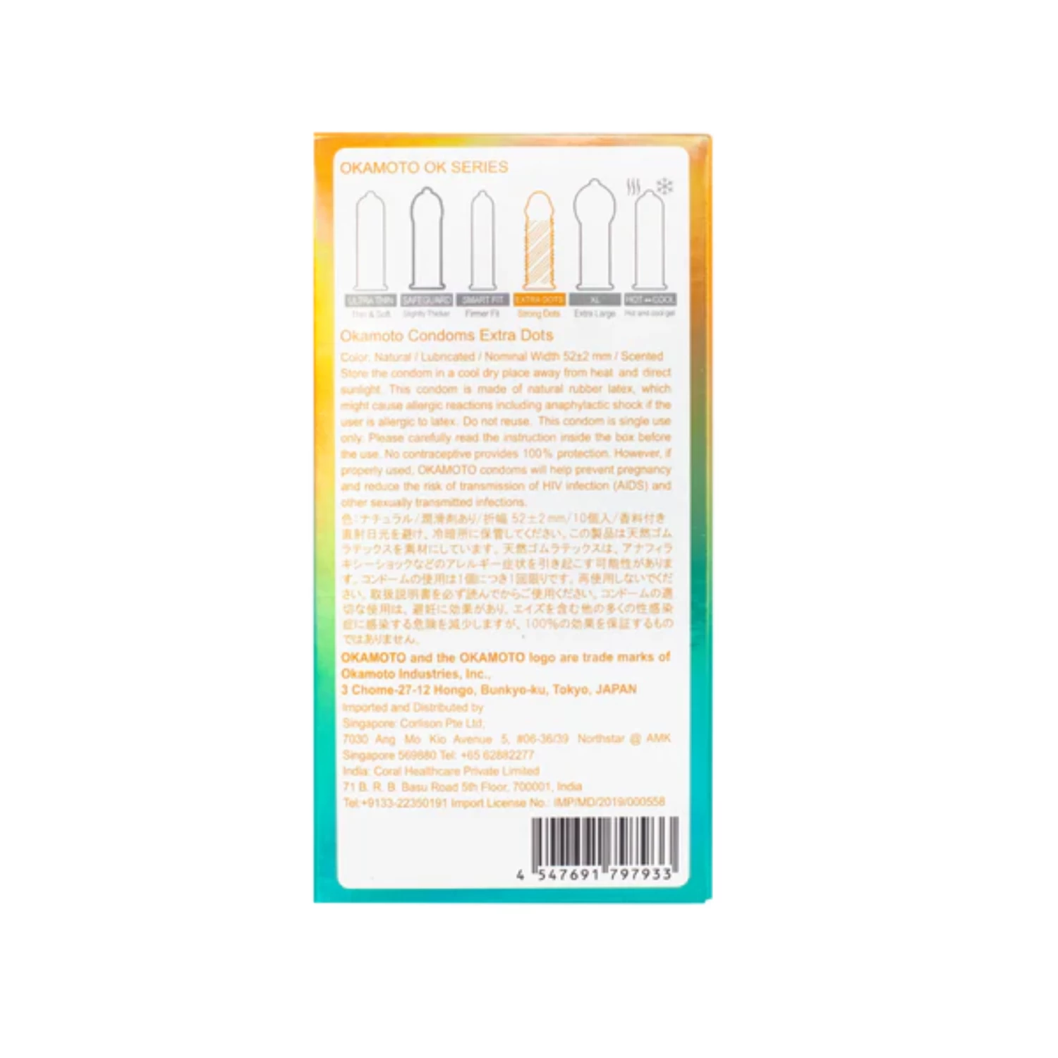 🧡 Okamoto Extra Dots Condoms are designed to stimulate passion and desire, targeting extra sweet spots to enhance sensation and arousal during sex.