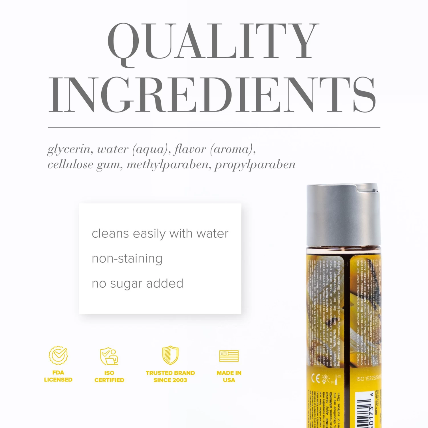 Ingredients: Glycerin, Water (Aqua), Flavor (Aroma), Cellulose Gum, Methylparaben, Propylparaben.