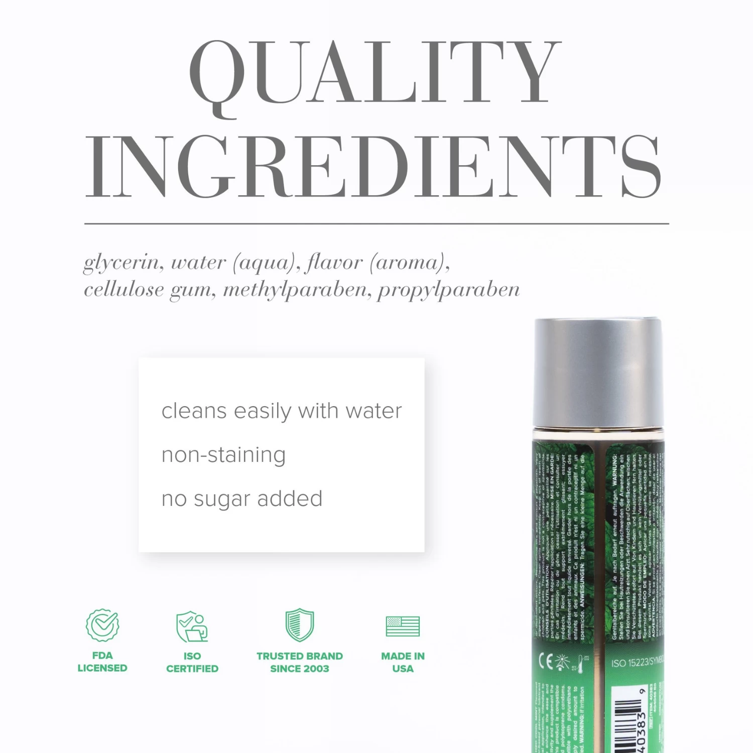Mint flavored, water based lubricant for a sweeter sensation. Clear, non-greasy and non-staining.