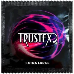 TRUSTEX Extra Large are lubricated, teat-ended, straight-sided, natural rubber latex condoms.
