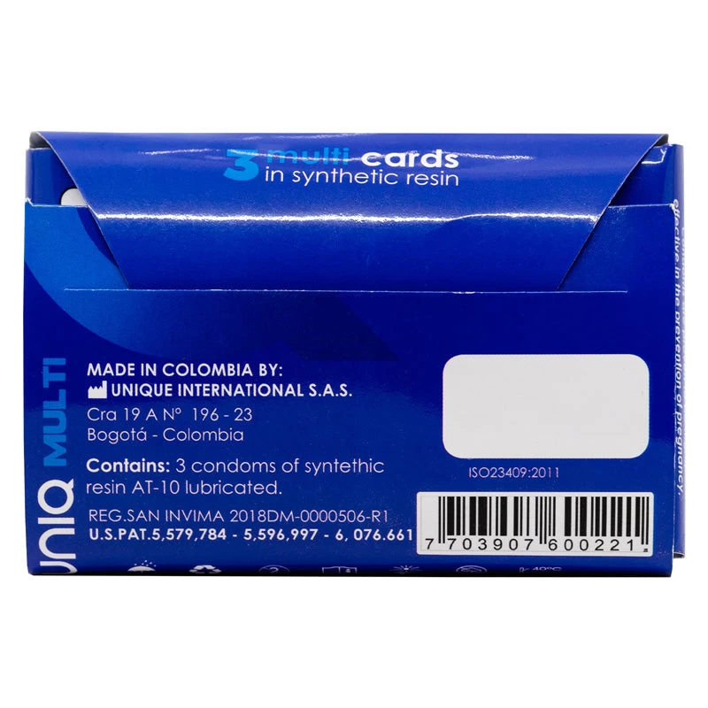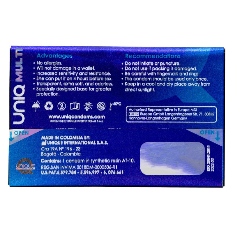 Perfect for men and women, innovative Uniq MULTI condoms come with a specially designed base. For ultimate protection use it as a male condom, a dam for oral or anal sex, to cover a genital area, or insert it inside the vagina even 4 hours before sexual intercourse. Unique modern 3 multi-cards condom packing is safe to keep in a wallet.